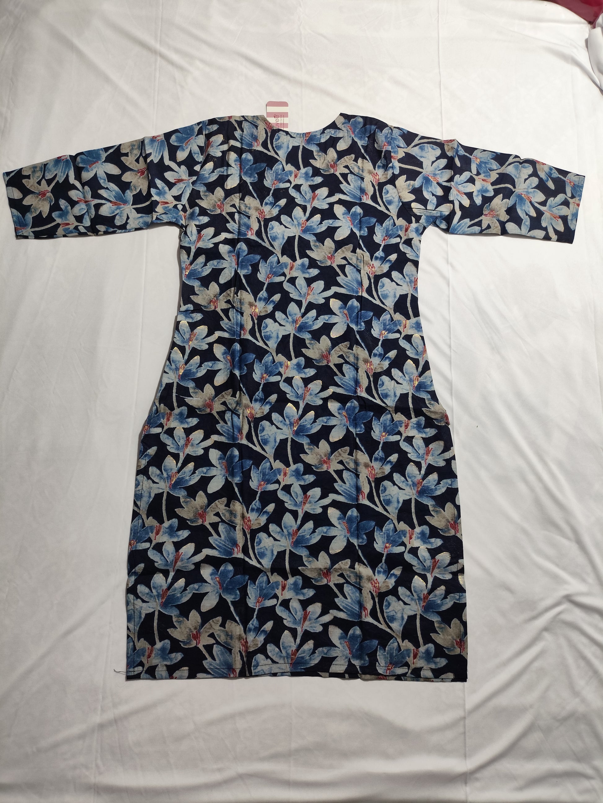 ডিজাইন: ডার্ক বেসে ব্লু-টোন ফ্লোরাল প্রিন্ট; গলার অংশে সূক্ষ্ম এমবেলিশমেন্ট/লেস-ওয়ার্ক, যা উৎসব বা স্পেশাল আউটিংয়ে এলিগ্যান্স বাড়ায় ।